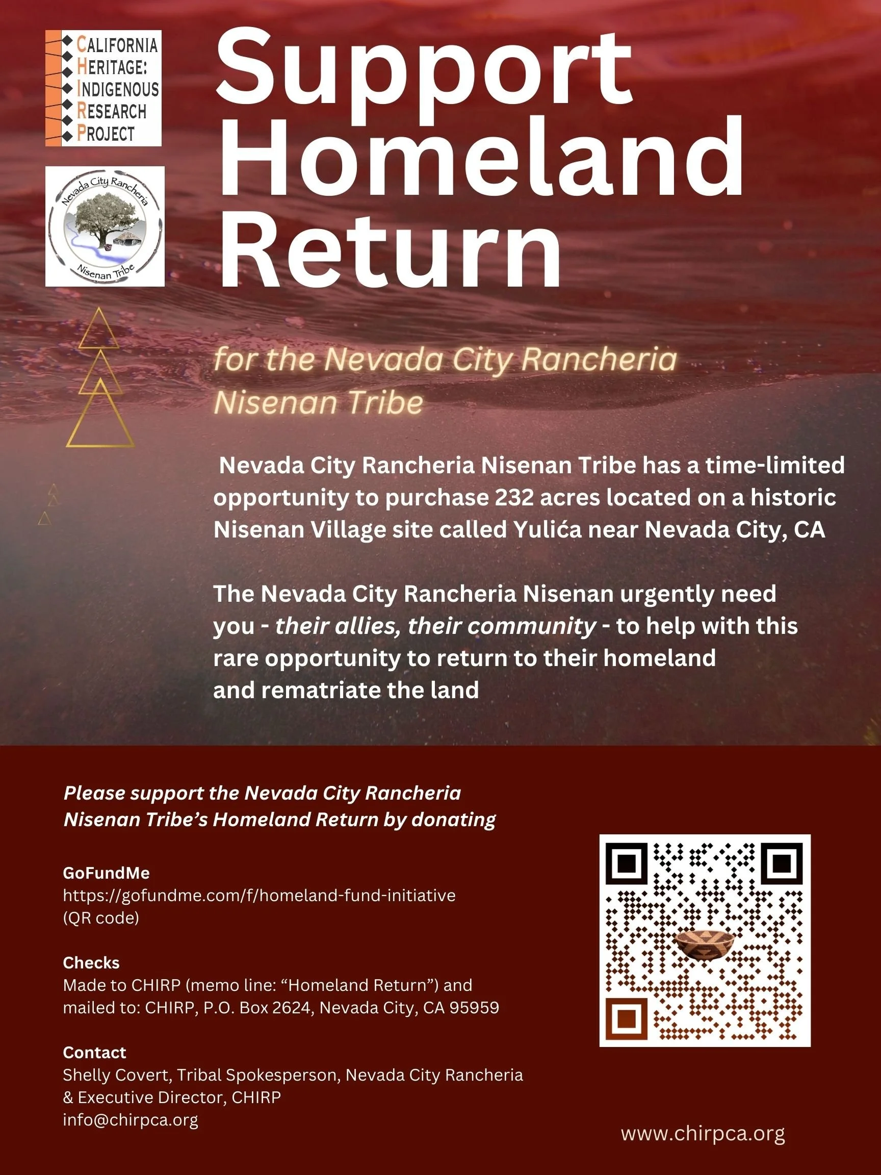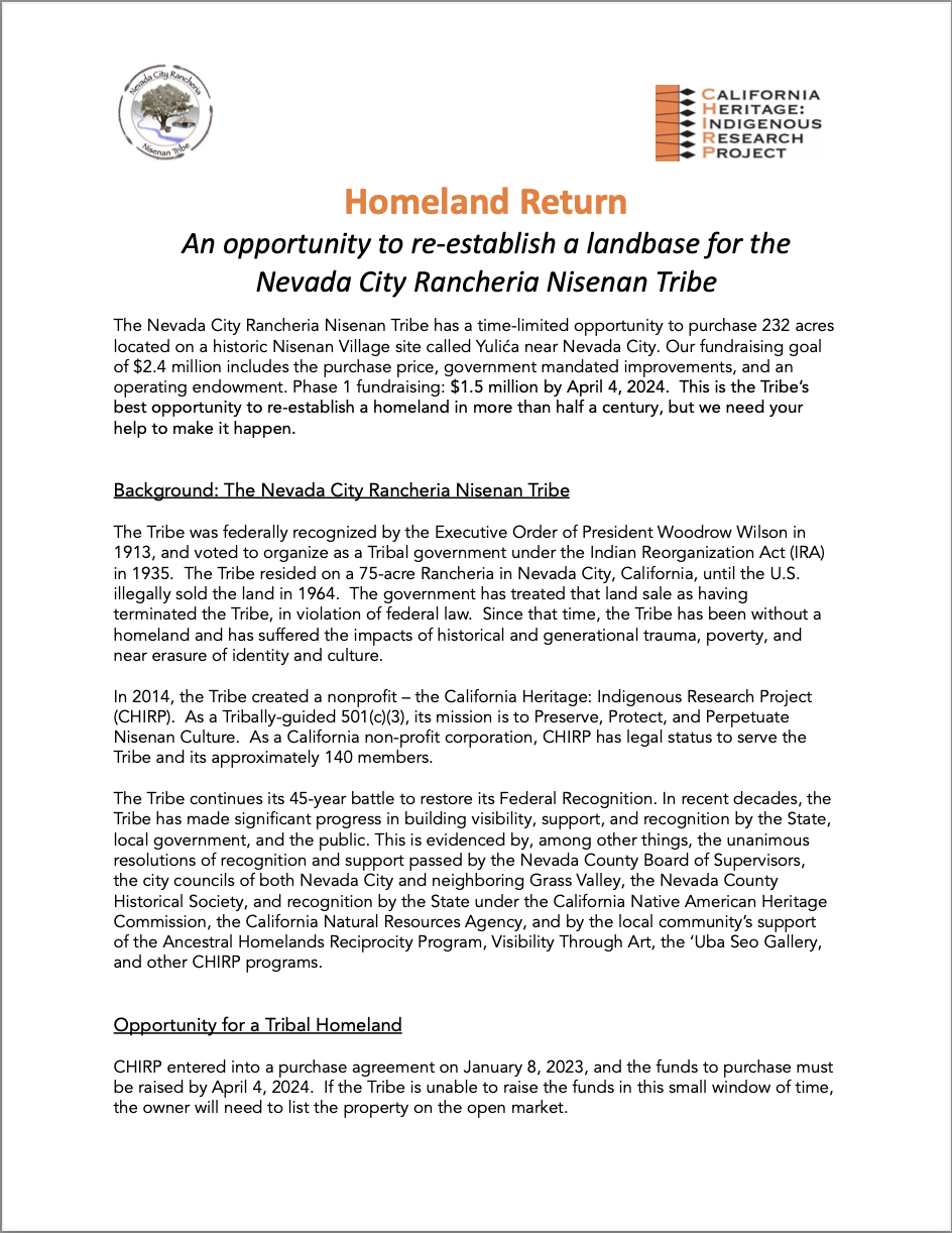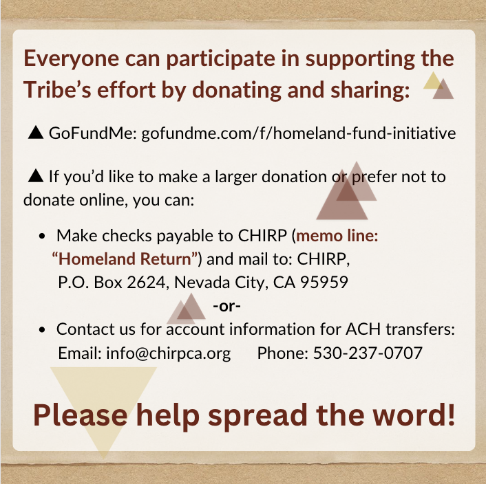 The Nevada City Rancheria Nisenan Tribe and CHIRP are so grateful for the tremendous outpouring of support and community engagement with the Homeland Return campaign.