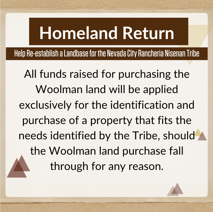 In this unprecedented moment, we have the opportunity to support the return of Ancestral Homelands to the Nisenan Tribe, and in turn offer opportunities for Tribal health and stability, cultural and spiritual preservation and revitalization, and community and environmental healing.